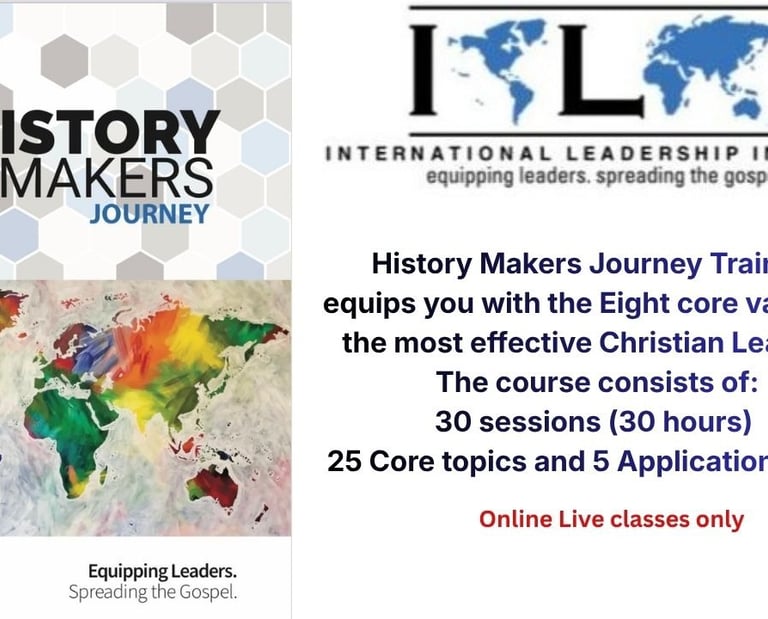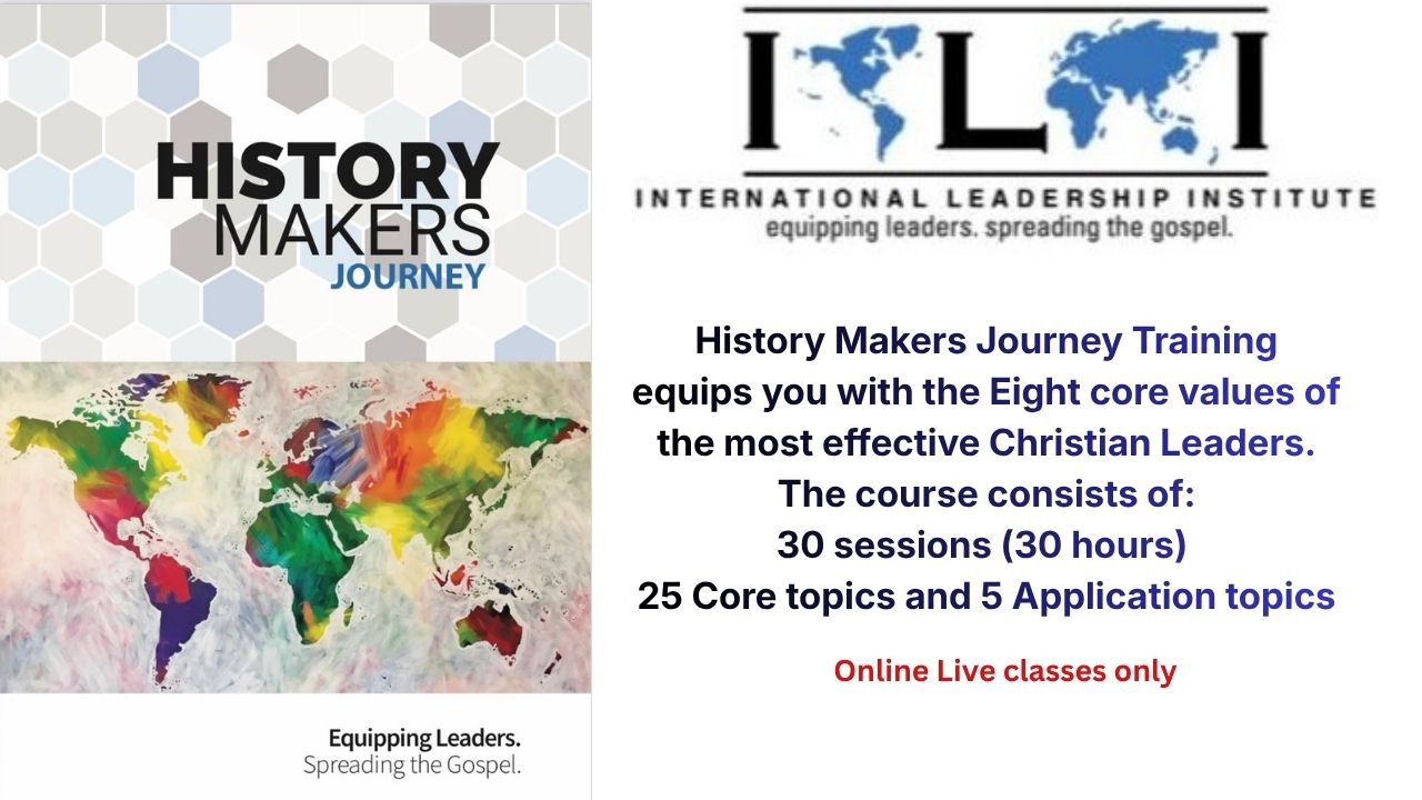History Makers Journey online training is provided by International Leadership Institute, USA. This is an essential course for Christian Leaders who are just starting off and seeking direction to start. The course duration is for 30 hours, the details of which will be provided to you on registration.